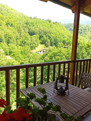 Ogni appartamento è dotato di un balcone privato con tavolino e sedie e vista sulle montagne.